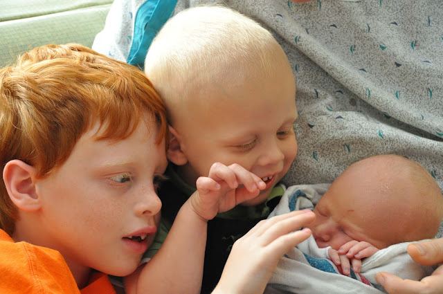 The boys were so excited to have a little brother. Especially Bryce... he waited at the hospital for a long time so that he could finally meet his youngest brother. He couldn't wait to see what color his hair was! We determined that he would probably be a red head like him but it was difficult to figure out since there was very little hair!